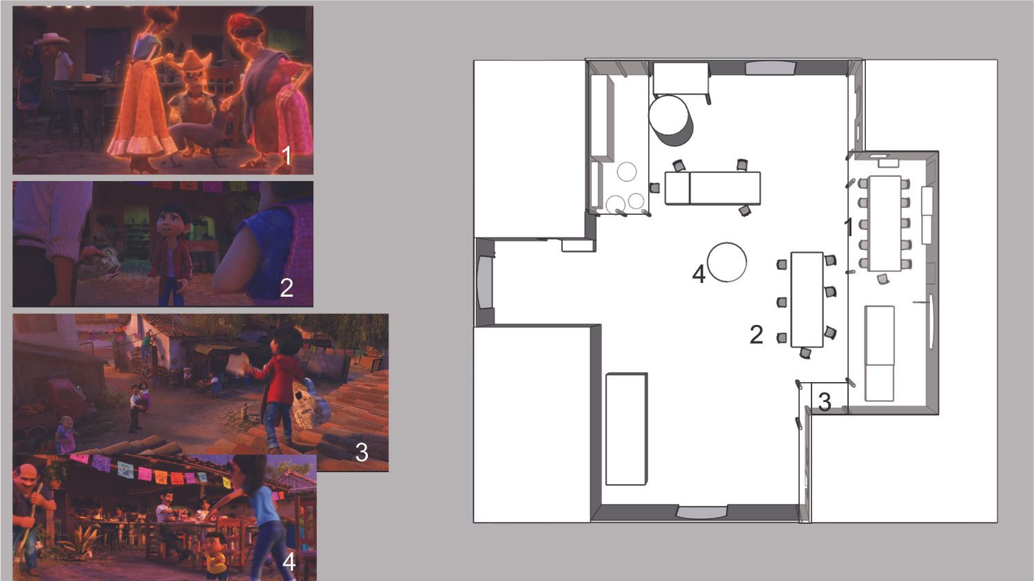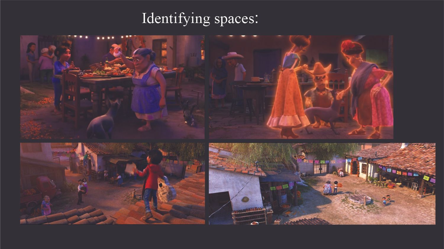 - Identify spaces on a movie scene and translate that into a complete 3D space. I chose the movie coco.