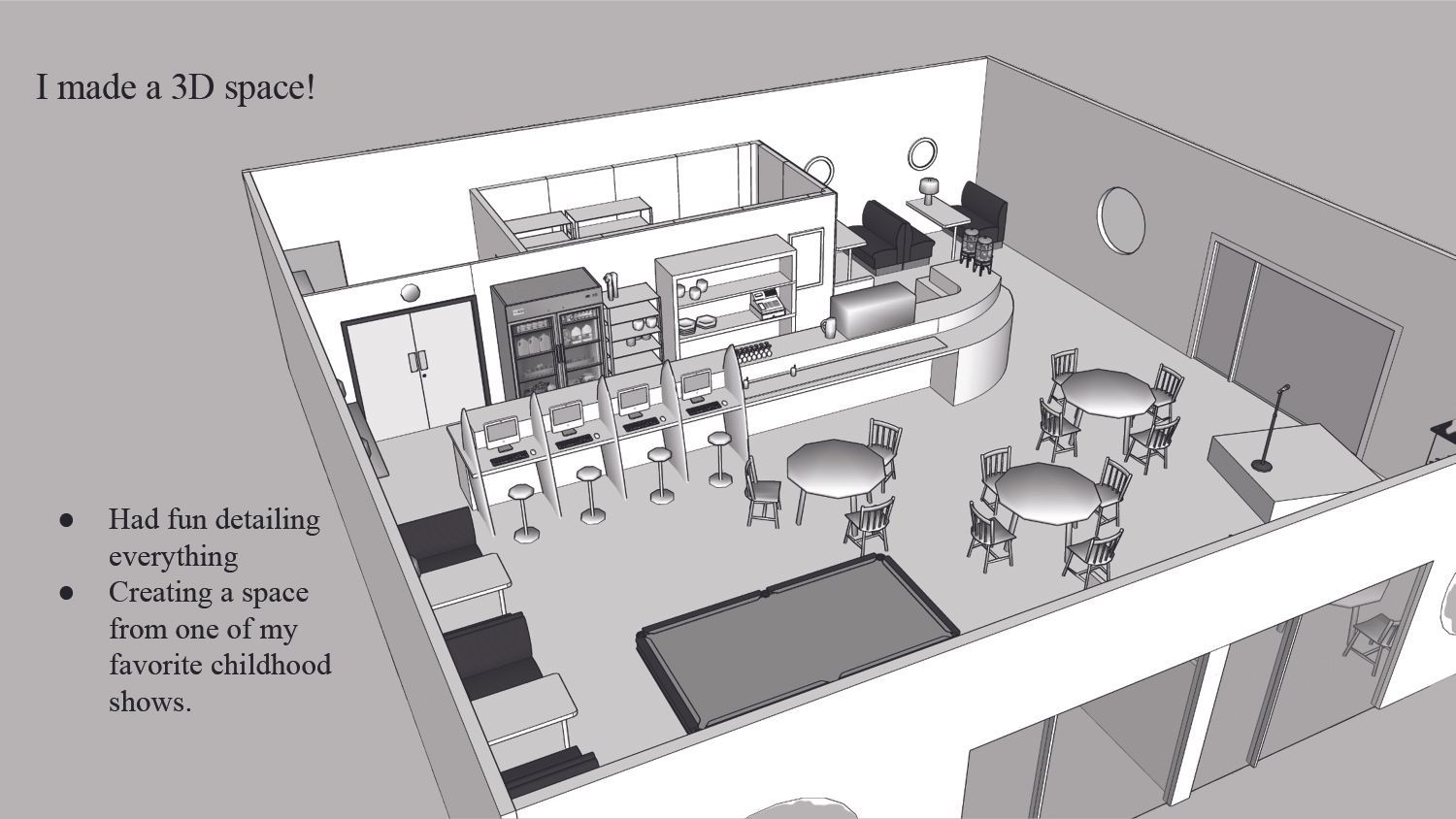 - Transform a space/scene from a TV show into a 3D space. Analyze and identify spaces using real life references to create the 3D space and floor plan. My chosen TV show was H2O: Just Add Water.