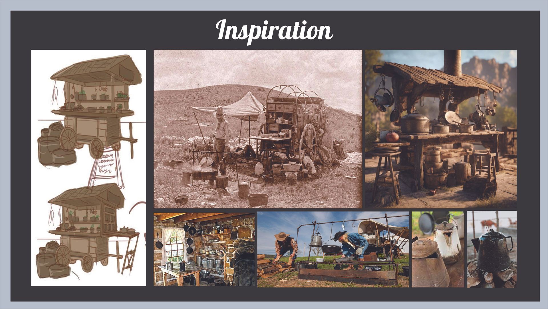 Underneath the canvas roof, you'll find an ample countertop workspace, complete with cast-iron skillets, vintage utensils, and containers. Hooks and holders display an array of cooking tools and accessories, all adding to the immersive experience.